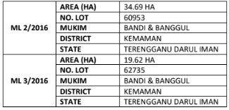 60953. The second lease, Mining Lease ML 3/2016 cover 19.62 hectares on Lot 62735.